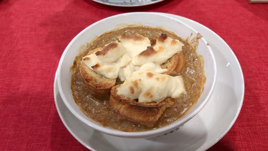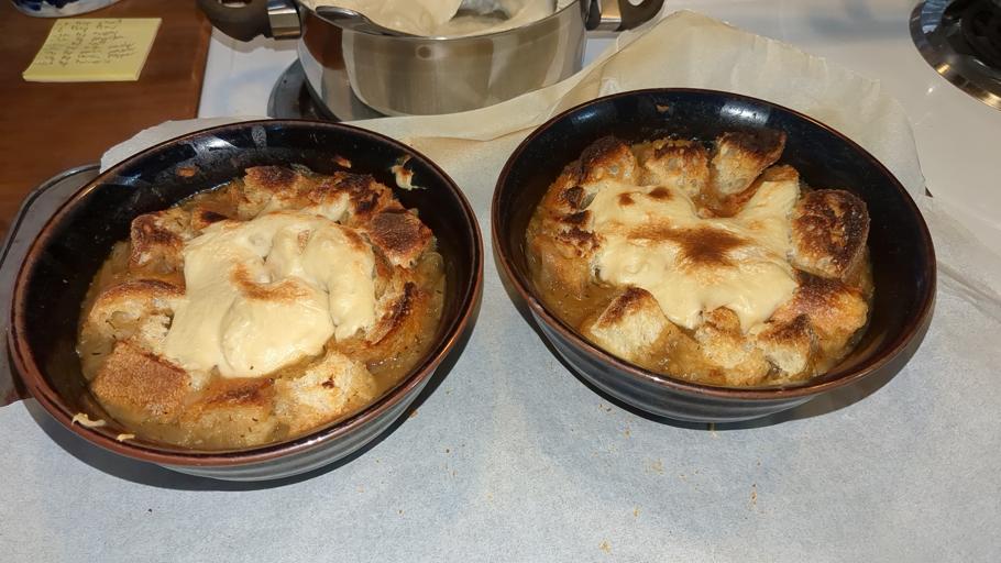 NOTE: Caramelizing onions takes a long time! The last time I did it it took 2 full hours, and even then they could've gone for longer. SOUP 1. Heat oil over medium-high heat, then add onions and cook until translucent, then add salt. Reduce heat and continue cooking until caramelized. 2. Add garlic and cook for another couple minutes, then add flour and cook for another minute. 3. Add the broth and seasonings and simmer for 15 minutes. BREAD Slice and toast in oven for a few minutes at 400F. SERVING 1. Ladle soup into bowl, then put bread on top, then cheese on top of the bread. 2. Broil until cheese is browned (about 5-10 minutes).