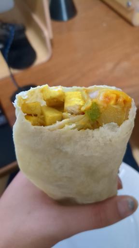 1. Parboil the potatoes, about 5 minutes. 2. Heat oil in a pan over medium heat, then add potatoes and fry for 10 minutes. 3. Add the rest of the veggies, and crumble the tofu into the pan. Add seasoning and cook for another 10 minutes, or until the veggies are cooked. Add additional salt and pepper to taste. 4. Lay out a tortilla on a clean surface, and scoop some filling onto it. Add hot sauce to taste, then wrap. Repeat until you run out of filling (or tortillas).